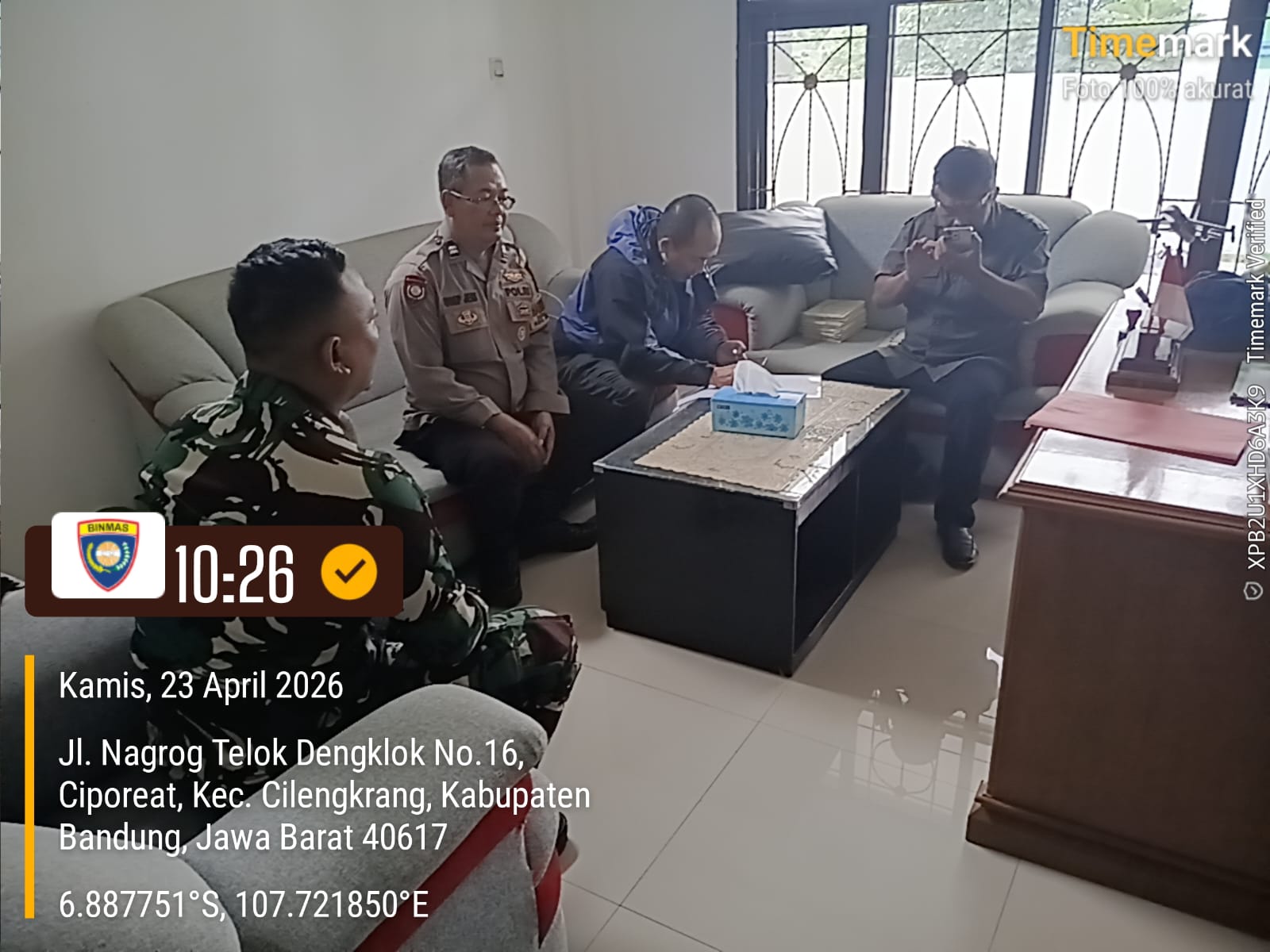 Bhabinkamtibmas Desa Ciporeat dari Polsek Cileunyi, Polresta Bandung, Aiptu Usep Jeni, S.Sos bersama Babinsa melaksanakan kunjungan kamtibmas ke Kantor Desa Ciporeat, Kecamatan Cilengkrang, Kabupaten Bandung. Kamis (23/4/2026)