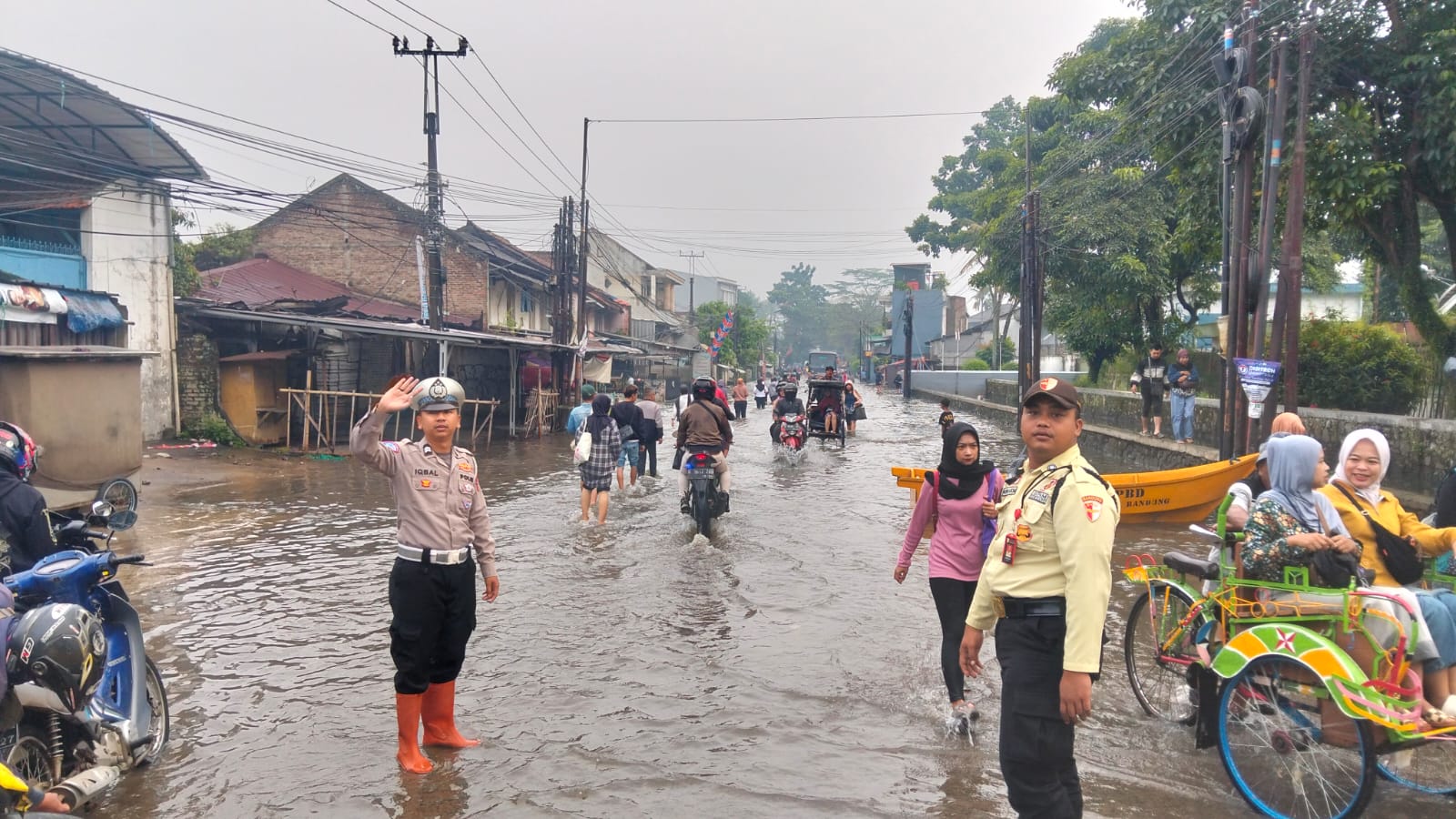 Kondisi ini terpantau pada Jumat (17/4/2026), di mana genangan air masih cukup tinggi di sejumlah titik. Di depan Pasar Dayeuhkolot, tepatnya kawasan Ria Busana, ketinggian air diperkirakan mencapai sekitar 70 cm. Sementara itu, di depan PT Metro Garment, genangan air masih berada di kisaran 50 cm.