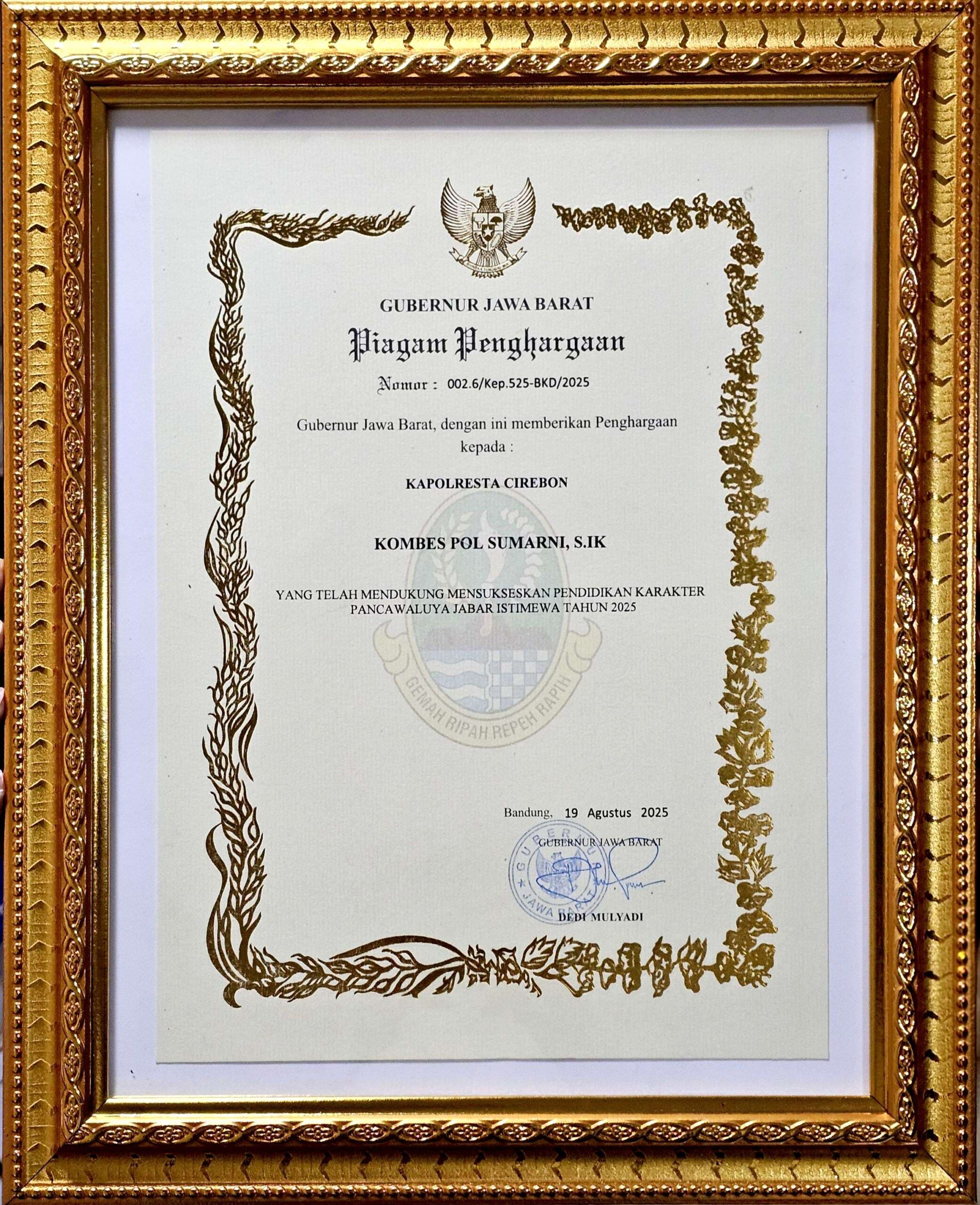 Kapolresta Cirebon Terima Penghargaan dari Gubernur Jawa Barat atas Peran dalam Pendidikan Karakter Anak Berhadapan dengan Hukum