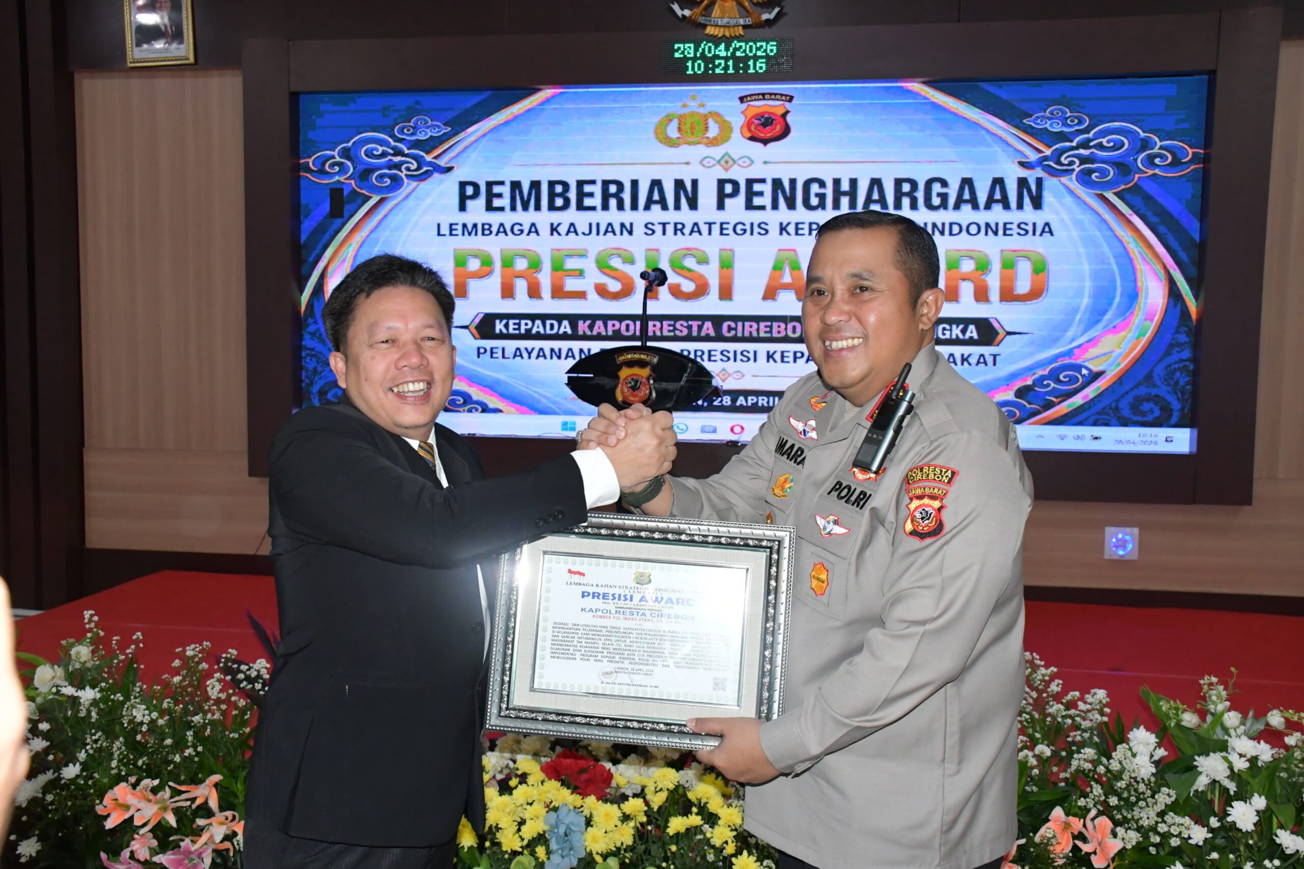 KATERCIKO.COM, Cirebon — Kapolresta Cirebon Kombes Pol Imara Utama, S.H., S.I.K., M.H., menerima penghargaan Presisi Award dari Lembaga Kajian Strategis Kepolisian Indonesia dalam sebuah kegiatan yang berlangsung di Aula Pesat Gatra Mapolresta Cirebon, Selasa (28/4/2026).
