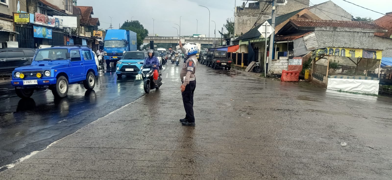 Personel Unit Lalu Lintas, Aiptu Awal Candra, melaksanakan Protap (Prosedur Tetap) pengaturan lalu lintas di depan Pasar Sehat Cileunyi, Desa Cileunyi Wetan, Kecamatan Cileunyi, Kabupaten Bandung. Sabtu (11/4/2026)