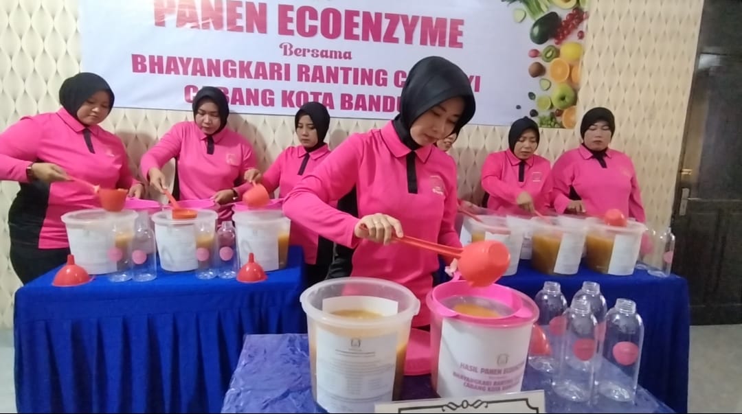 Kegiatan panen ecoenzyme tersebut dilaksanakan pada Sabtu, 28 Februari 2026, di Ruang Bhayangkari Ranting Cileunyi, Jalan Panyawungan No. 5, Desa Cileunyi Wetan, Kecamatan Cileunyi, Kabupaten Bandung. Suasana penuh semangat dan kebersamaan terasa saat Ketua Bhayangkari Ranting Cileunyi, Ny. Desti Anggy Prasetiyo, bersama para pengurus membuka toples-toples fermentasi yang telah diproses sejak 28 November 2025 lalu.
