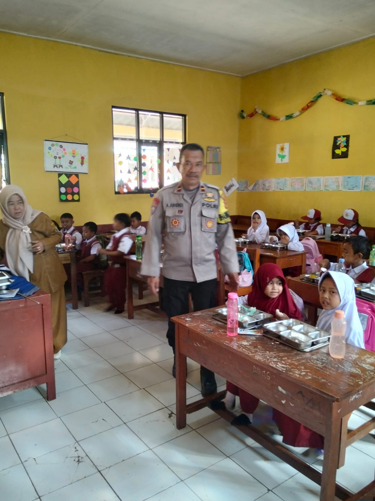 Bhabinkamtibmas Desa Mekarpawitan menjelaskan bahwa pendampingan ini bertujuan memastikan kelancaran pembagian makanan sekaligus memberikan edukasi kepada para siswa mengenai pentingnya pola makan sehat.