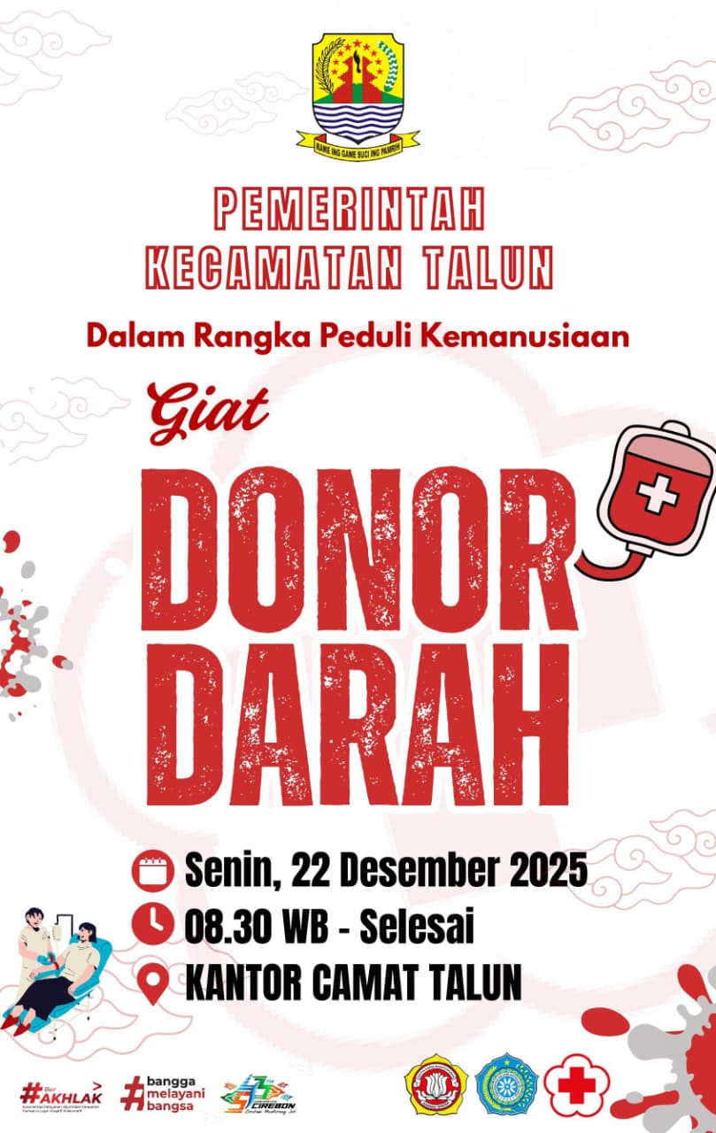 Kegiatan donor darah tersebut akan dilaksanakan pada Senin, 22 Desember 2025, mulai pukul 08.00 WIB, bertempat di Gedung Kecamatan Talun, Kabupaten Cirebon. Kegiatan ini terbuka bagi masyarakat umum, aparatur pemerintahan, serta berbagai elemen masyarakat yang ingin berpartisipasi.