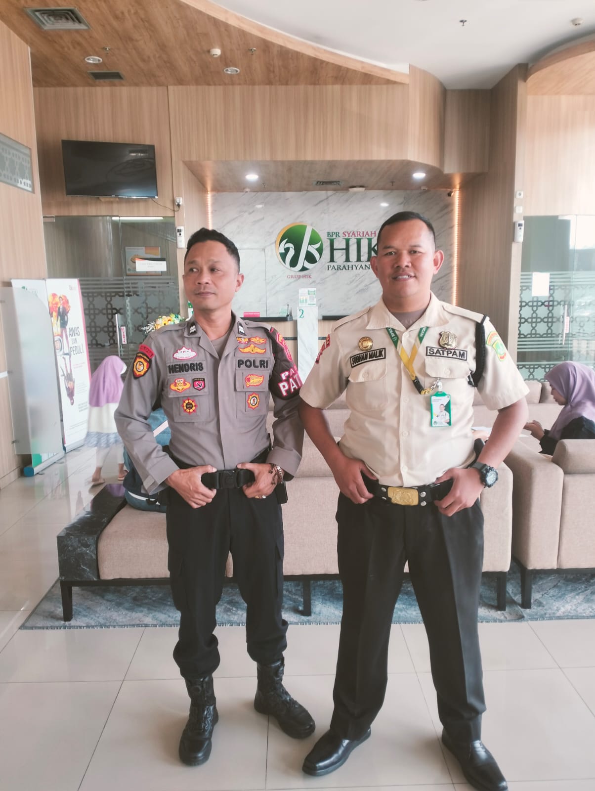 Dalam kegiatan tersebut, Aiptu Hendris Cecep berdialog langsung dengan petugas satpam yang berjaga di lingkungan bank. Suasana komunikasi berlangsung santai namun tetap fokus pada pembahasan keamanan.