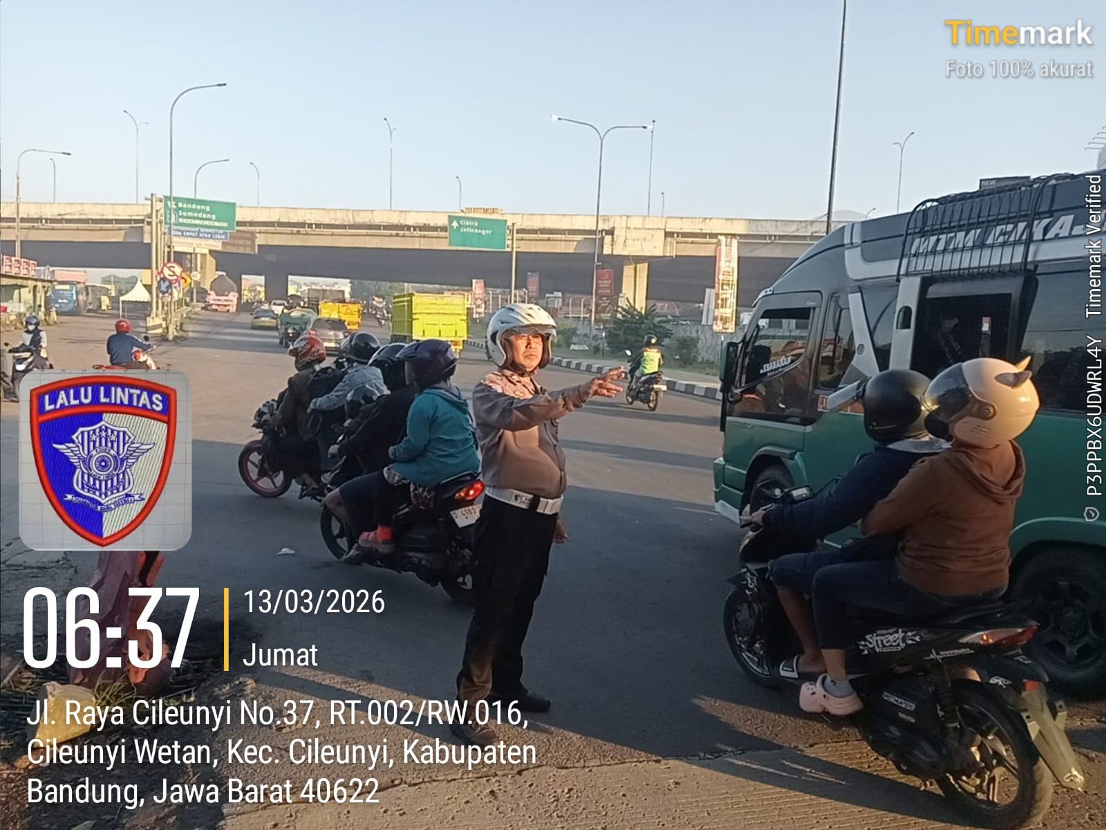 Seperti yang dilakukan oleh personel Unit Lalu Lintas dari Polsek Cileunyi jajaran Polresta Bandung, Aiptu Hadriansyah yang melaksanakan pengaturan lalu lintas pada pagi hari di kawasan Pertigaan Jalan Panyawungan, Desa Cileunyi Wetan, Kecamatan Cileunyi, Kabupaten Bandung. Jum’at (13/3/2026)