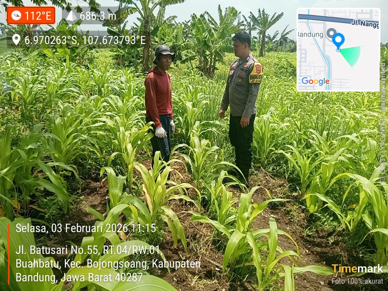 KATERCIKO.COM,BOJONGSOANG, KAB. BANDUNG – Selasa, 03 Februari 2026. Peran Kepolisian kini tidak hanya sebatas menjaga keamanan, namun juga aktif mendukung program ketahanan pangan nasional di tingkat desa. Pagi ini, Bhabinkamtibmas Desa Buahbatu, Bripka Saepul, melaksanakan kegiatan monitoring perkembangan tanaman jagung di lahan pertanian milik warga, Sdr. Tulus, yang berlokasi di Batusari RT 04 RW 01, Desa Buahbatu, Kecamatan Bojongsoang.