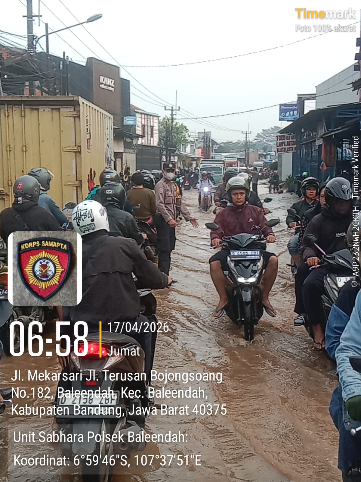 KATERCIKO.COM, Baleendah – (17/04/2026) Guna menjaga kelancaran arus lalu lintas di tengah kondisi genangan air banjir, jajaran Polsek Baleendah melaksanakan kegiatan strong point di Jalan Terusan Bojongsoang, Kampung Cikarees, Kecamatan Baleendah, Kabupaten Bandung.