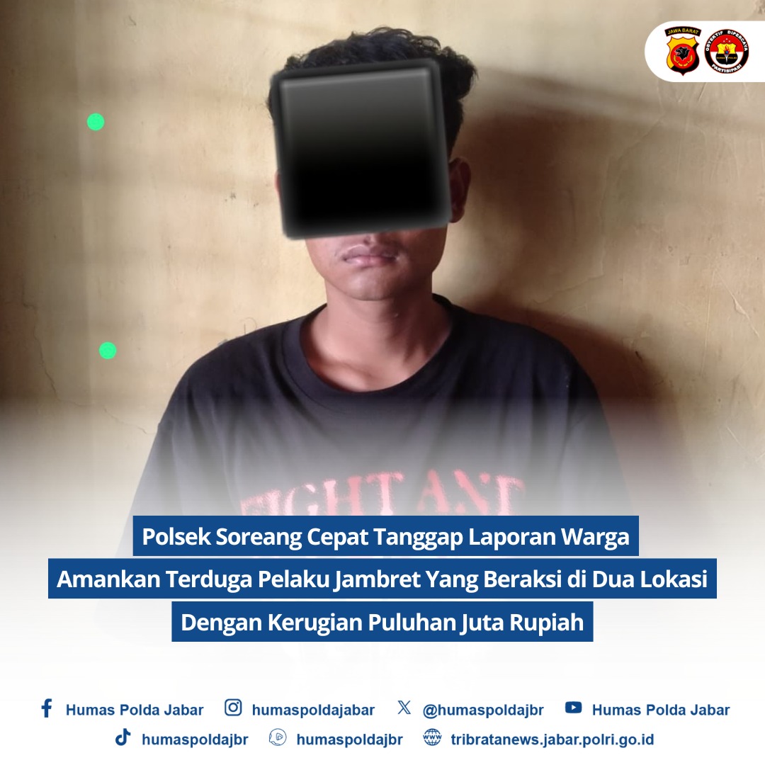 KATERCIKO.COM, Polsek Soreang Polresta Bandung berhasil mengamankan seorang pemuda berinisial RAA (21) yang diduga sebagai pelaku tindak pidana pencurian dengan pemberatan atau jambret. Penangkapan ini berawal dari laporan masyarakat melalui program Lapor Pak Kapolresta terkait dua kejadian jambret yang meresahkan warga di wilayah Kutawaringin dan Soreang, Kabupaten Bandung.