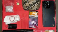Dari hasil penggeledahan awal, petugas menemukan satu unit handphone Infinix, dompet berisi STNK, serta bungkus rokok bertuliskan “DJANDA” yang berisi enam kaca alat hisap sabu. Penggeledahan dilanjutkan ke sepeda motor, dan di bagian dasbor ditemukan satu dompet batik yang dibalut tisu dan diikat karet merah. Di dalamnya terdapat plastik klip berisi kristal putih yang diduga sabu dan dua tablet hijau yang diduga ekstasi.