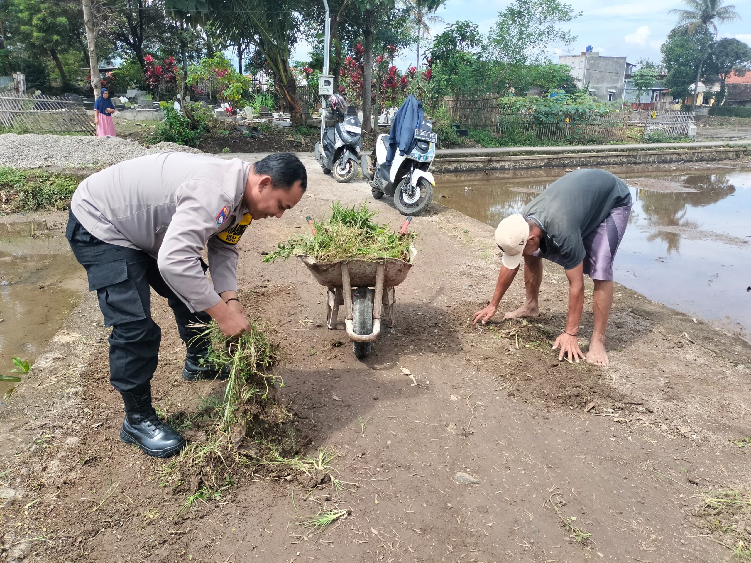 KATERCIKO.COM, Polresta Bandung, – Bhabinkamtibmas Desa Tanjunglaya Polsek Cikancung, Polresta Bandung Aipda Andres Nugraha bersama warga masyarakat desa binaannya melaksanakan Gotong Royong Membersihkan Rumput-rumput di pinggiran jalan makam Kp Peundeuy, Rt. 01, Rw. 13, Desa Tanjunglaya, Kecamatan Cikancung, Kabupaten Bandung. Selasa (18 Maret 2025)